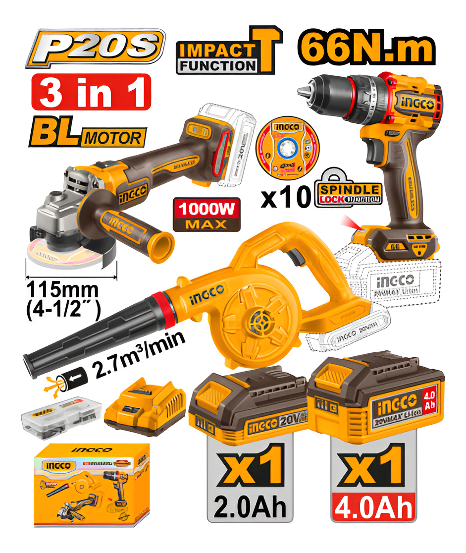 KIT COMBO A BATERIA P20S 20V AMOLADORA ANGULAR 4½» 115MM + TALADRO ATORN. C/PERCUTOR 66NM + SOPLADORA + 2 BAT 4.0AH Y 2.0AH + CARGADOR + ACCESORIOS
