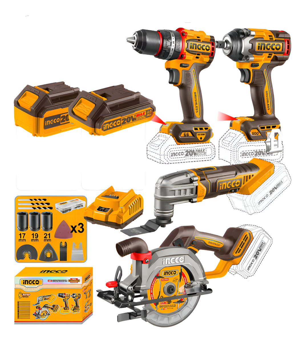 Kit Ingco 4 Herramientas 20v Sin Carbones, 2 Baterías