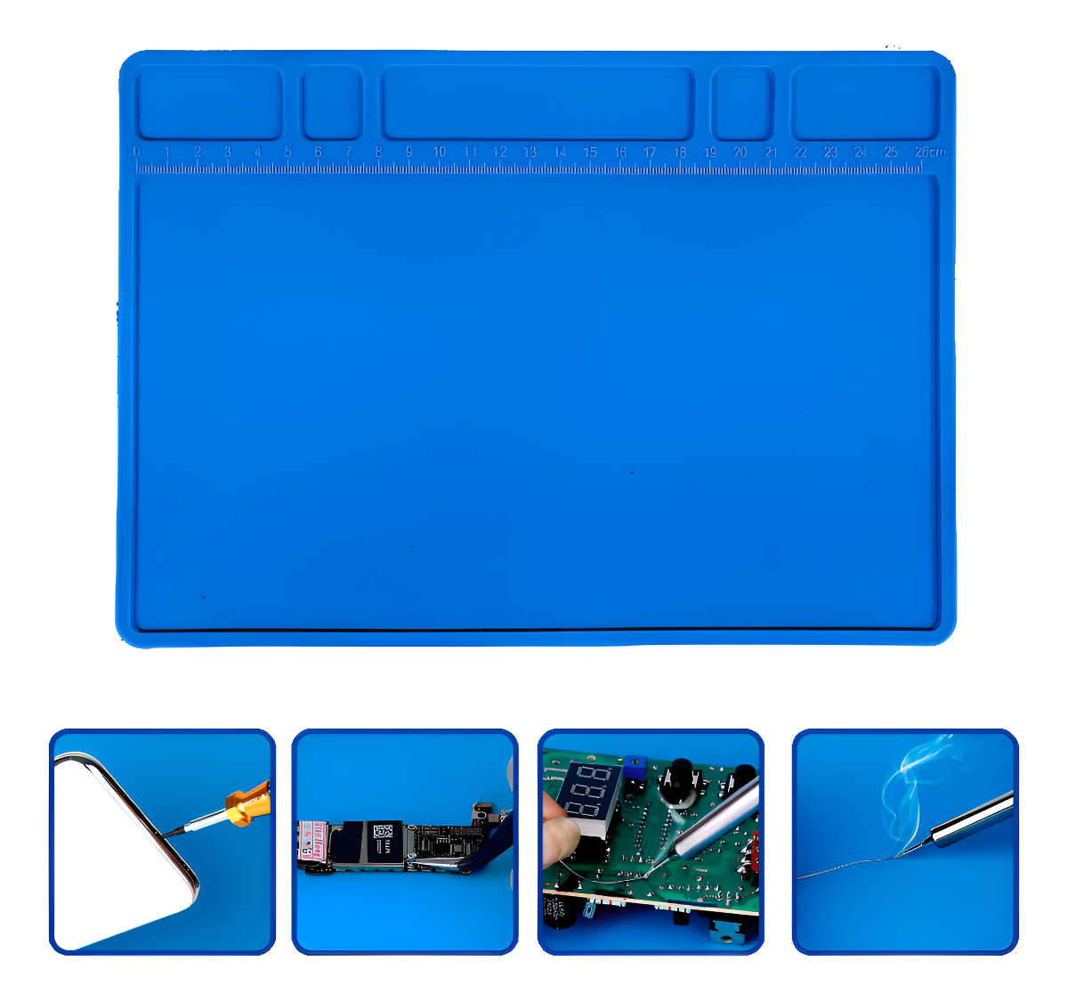 TamaƱo: 355mm 255mm-Grosor: 5,5 mm-3 Ɣreas de piezas magnƩticas-50 posiciones de tornillos-Regla de escala incorporada: 29cm-Temperatura mƔxima de resistencia 500 -Silicona de alta calidad,